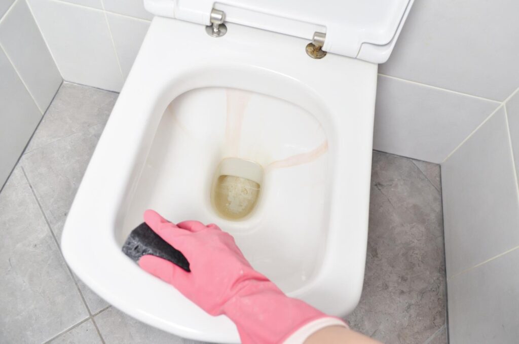 - Scrub the bowl, base, and behind the toilet